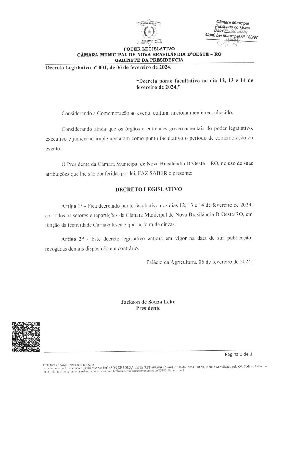 Decreto Legislativo 001/2024 - Ponto Facultativo